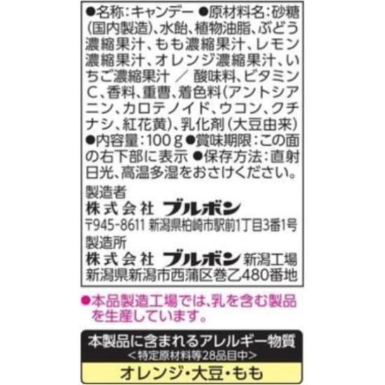 砂糖(国内製造)、水飴、植物油脂、ぶどう濃縮果汁、もも濃縮果汁、レモン濃縮果汁、オレンジ濃縮果汁、いちご濃縮果汁/酸味料、ビタミンC、香料、重曹、着色料(アントシアニン、カロテノイド、ウコン、クチナシ、紅花黄)、乳化剤(大豆由来)