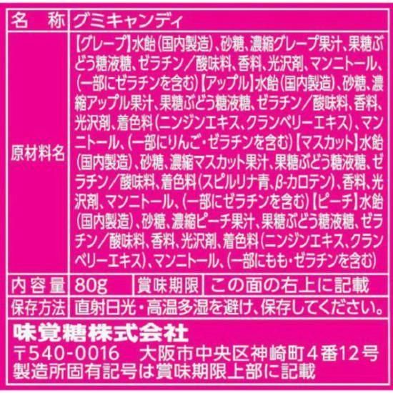 ・グレープ:水飴(国内製造)、砂糖、濃縮グレープ果汁、果糖ぶどう糖液糖、ゼラチン/酸味料、香料、光沢剤、マンニトール、(一部にゼラチンを含む)