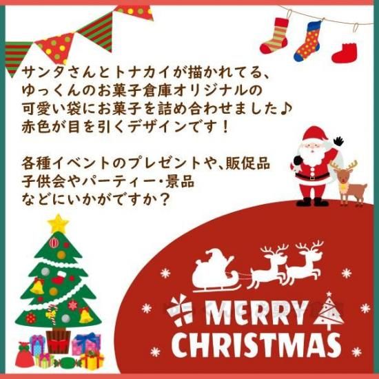 ■クリスマスにピッタリの、サンタさんとトナカイ柄が書かれた ゆっくんのお菓子倉庫オリジナル袋にお菓子を詰め合わせました。