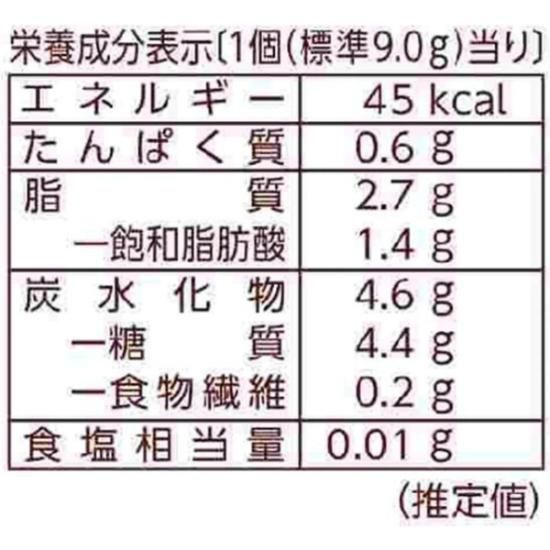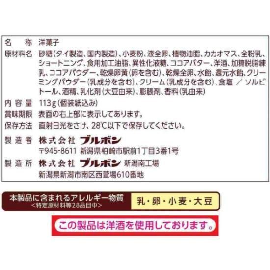 砂糖(タイ製造、国内製造)、小麦粉、液全卵、植物油脂、カカオマス、全粉乳、ショートニング、食用加工油脂、異性化液糖、ココアバター、洋酒、加糖脱脂練乳、ココアパウダー、乾燥卵黄(卵を含む)、乾燥全卵、水飴、還元水飴、クリーミングパウダー(乳成分を含む)、クリーム(乳成分を含む)、食塩/ソルビトール、酒精、乳化剤(大豆由来)、膨脹剤、香料(乳由来)