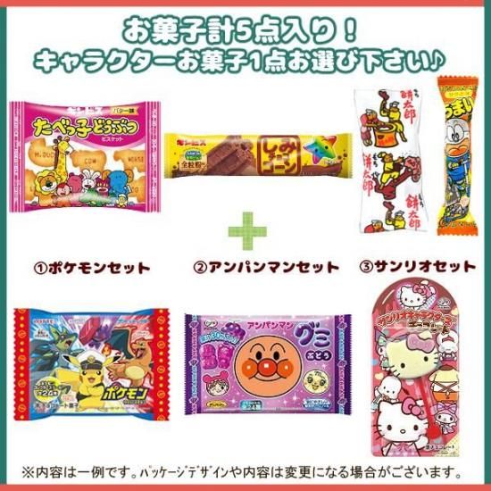お菓子計5点入り。キャラクターお菓子1点選択肢よりお選び下さい♪