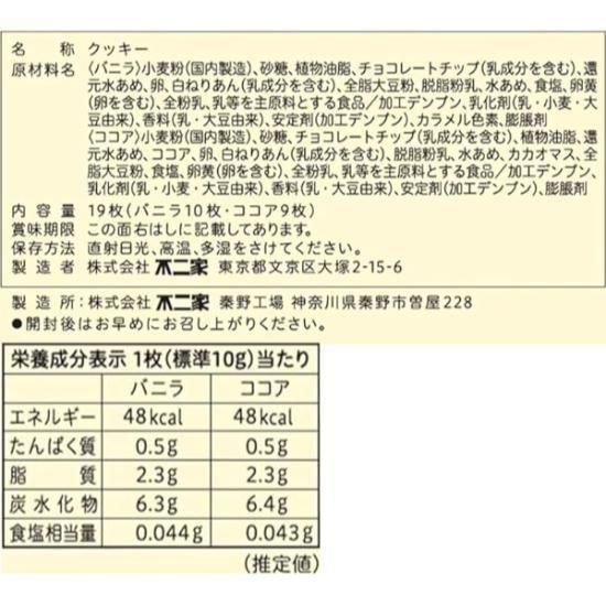 小麦粉(国内製造)、砂糖、チョコレートチップ(乳成分を含む)、植物油脂、還元水あめ、ココア、卵、白ねりあん(乳成分を含む)、脱脂粉乳、水あめ、カカオマス、全脂大豆粉、食塩、卵黄(卵を含む)、全粉乳、乳等を主要原料とする食品/加工デンプン、乳化剤(乳・小麦・大豆由来)、香料(乳由来)、安定剤(加工デンプン)、膨脹剤